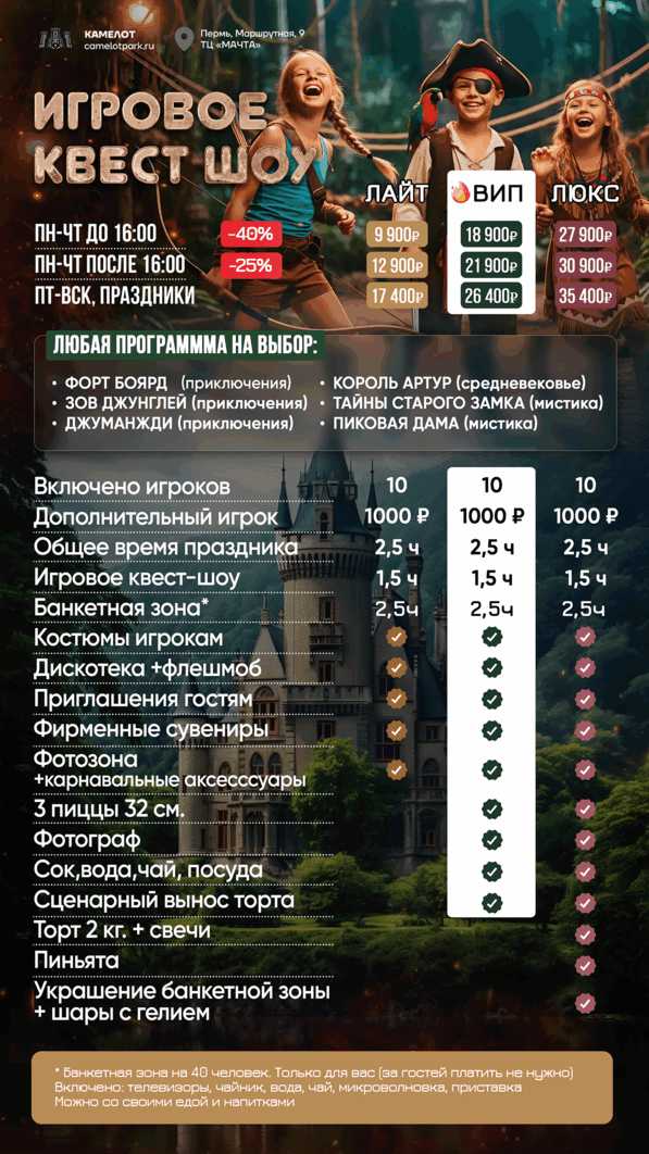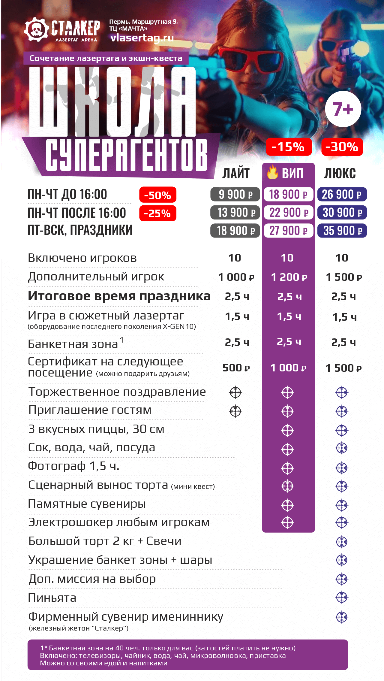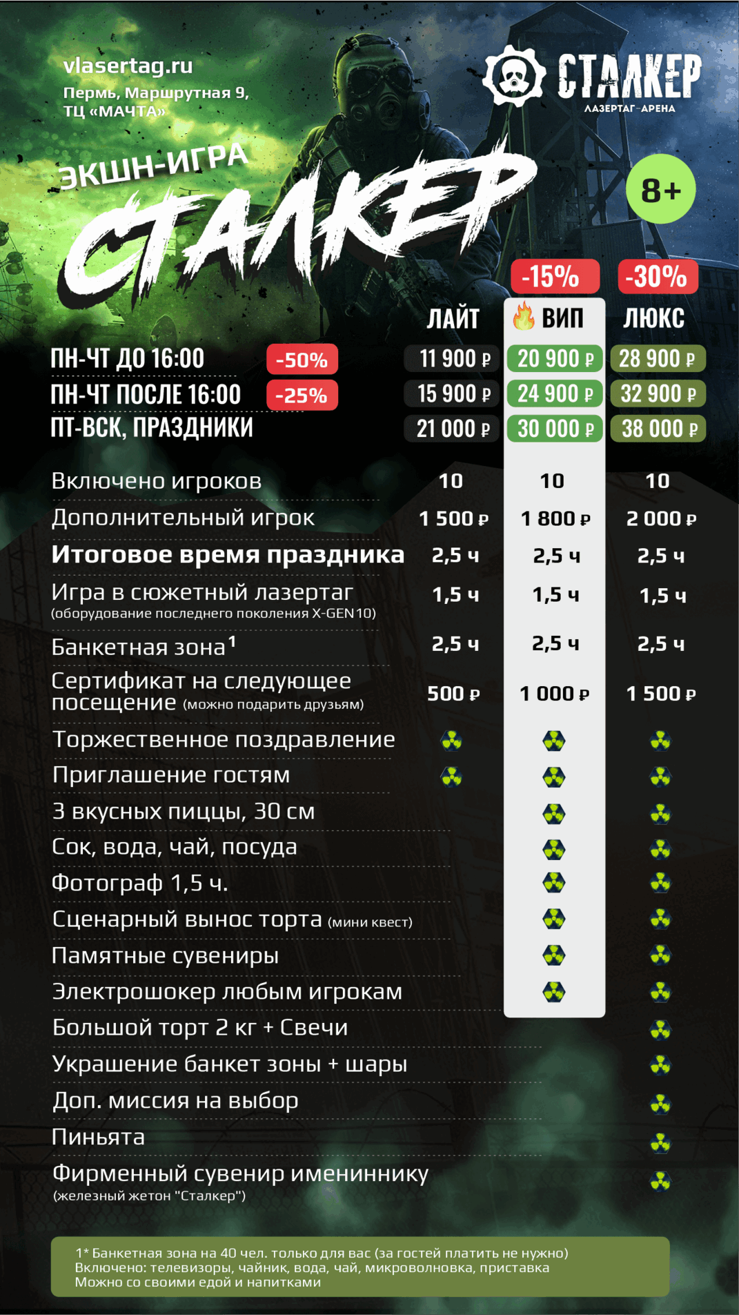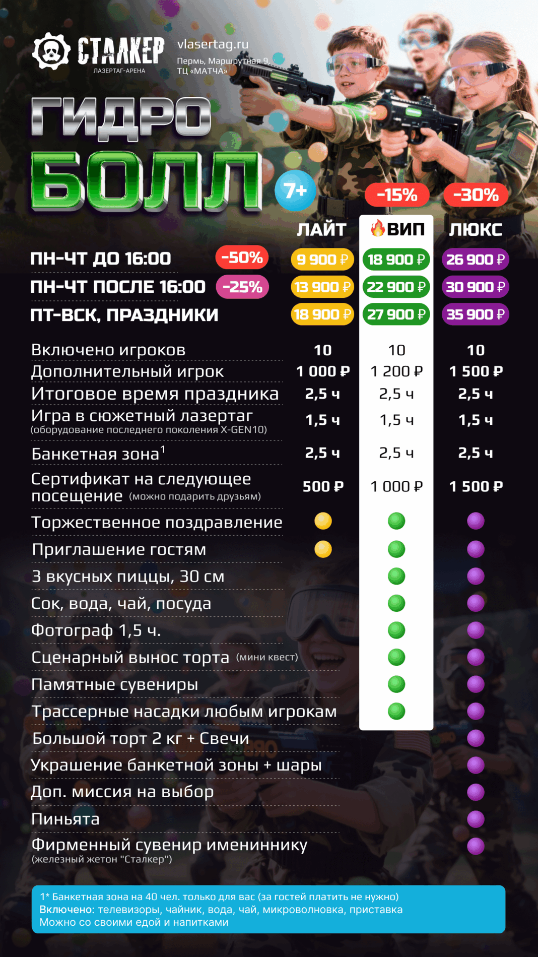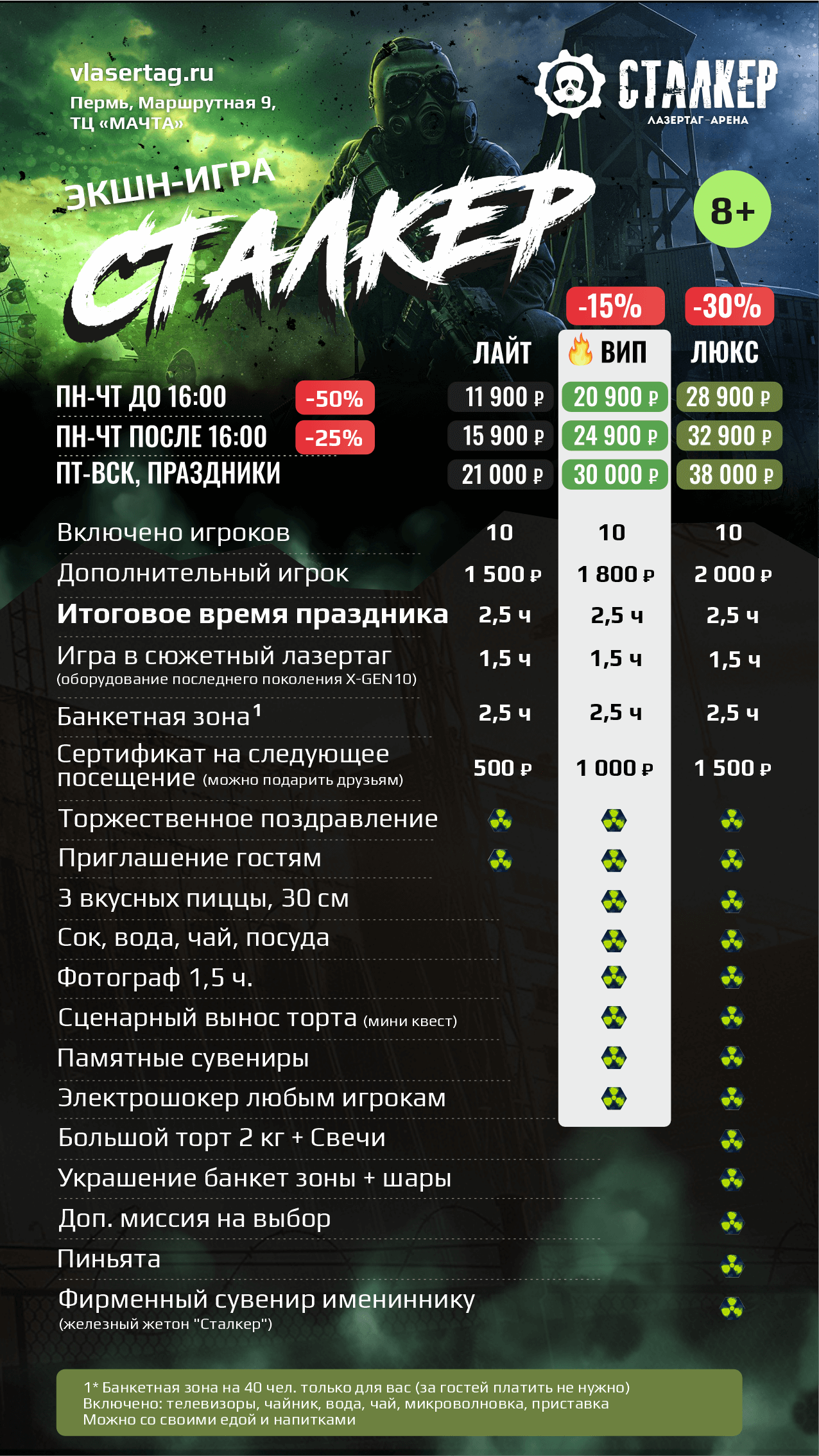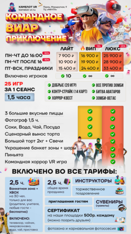 | | 🔫 ЛАЗЕРТАГ за 10 чел 🔫 ЛАЗЕРТАГ за 10 чел | 🥽 ВИАР за 10 чел 🥽 ВИАР за 10 чел | 🗝️ КВЕСТЫ за 10 чел | 2 ПЛОЩАДКИ СРАЗУ | ВСЕ 3 ПЛОЩАДКИ |