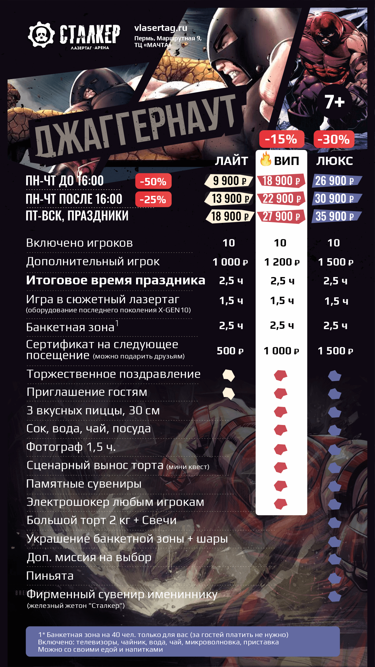 | ПТ,СБ,ВСК, ПРАЗДНИКИ ПТ,СБ,ВСК, ПРАЗДНИКИ | 16 900 ₽ | 15 400 ₽ | 17 900 ₽ | -10% | -20% |